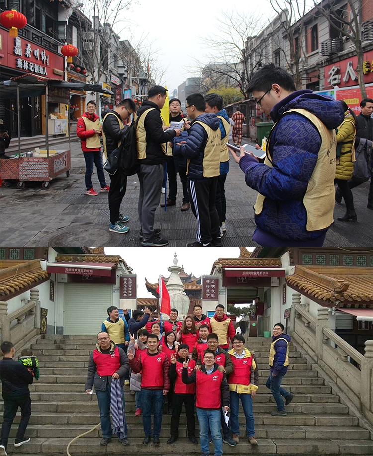 上午8點50分在江灘集合后,教練帶領大家進行了活動前的趣味熱身游戲,然后將所有人員分成兩隊,黃隊和紅隊,本次比賽共分為六個賽點,每個賽點分別設定了一項主題任務由團隊通力協作完成,兩隊參賽隊伍需完成全部六個賽點,全程用時最少者獲勝。本次活動我們精心選取了武漢戶部巷、黃鶴樓等具有代表性的自然、人文景觀,讓大家共同穿越了戶部巷的大街小巷,領略了濃烈的風土人情,別味的特色和人文風光。兩支隊伍各出奇招,文武并用,最終,紅隊獲得了本次城市定向尋寶活動的勝利。